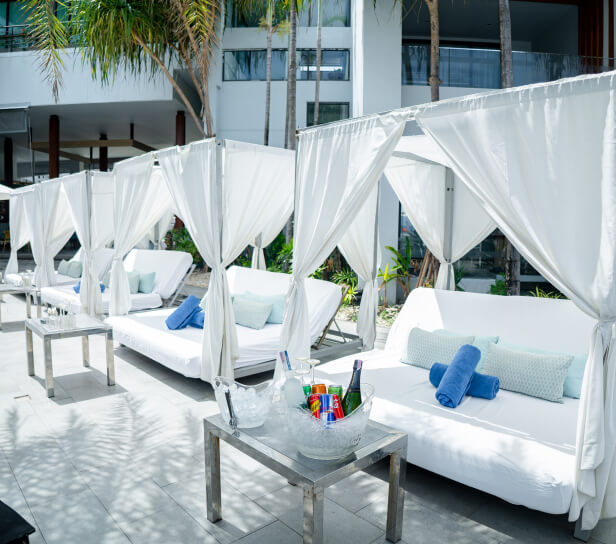 Our large sofa places you right next to the swimming pool, offering you and your friends the best location in the house! Book it for the day, and complete your package with our beverage options. Click on ‘Book Now’ to view the full range of amenities we have in store!